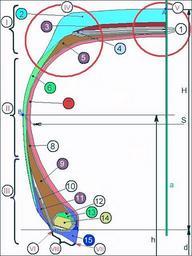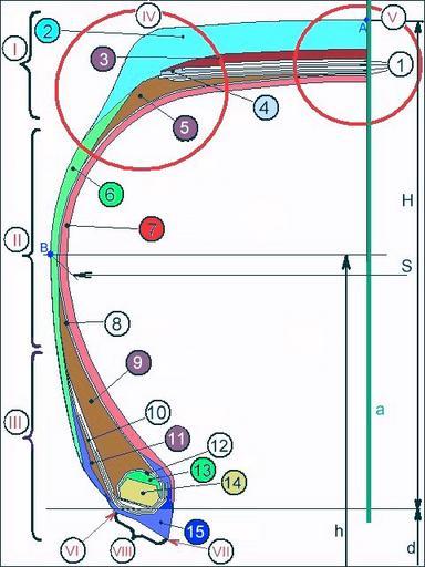 | Keywords: TyreSection.jpg Structure of a tyre<br>1 - belts tread plies 2 - tread cap 3 - tread base tread cushion 4 - tread ply wedge decoupling rubber 5 - belt cushion tread ply insert 6 - sidewall rubber 7 - innerliner 8 - carcass 9 - bead filler 10 - steelcord chafer bead reinforce 11 - sidewall filler 12 - bead wrap 13 - bead core filler 14 - bead bundle 15 - abrasion gum strip rubber chafer <br> I - tread area II - sidewall area III - bead area IV - shoulder area V - tread center area VI - bead heel VII - bead toe VIII - bead base <br> A - centerline B - the widest point of the section H - section height S - section width h - diameter of the widest point d - bead seat diameter own 2008-01-24 Kifoc Released into the public domain by the author technology Rubber Cross sections of tires Language-neutral diagrams |