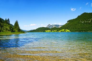 Keywords: tyrol haldensee austria tannheim mountains water nature summer lake leisure holiday recovery idyll horizontal in the free rest landscape trees forest bergsee