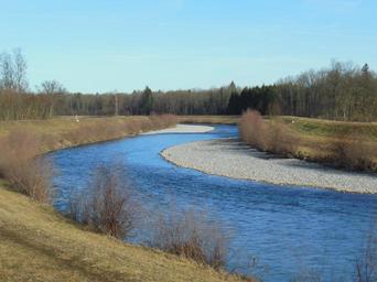 Keywords: tyrolean ache spring overseas at the chiemsee chiemgau upper bavaria bavaria river water gravel bed gravel bank bushes bank