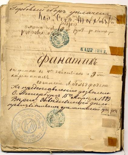 | Keywords: TZWEY.jpg en Copy of Yiddish play Fanatik writen by A Goldfadn with censor s stamp of 8 April 1882 he העתק ש האופרטה פאנאטיק ע חותמת הצנזורה ש 8 אפרי 1882 http //www yivoencyclopedia org/article aspx/Theater/Yiddish_Theater Author PD-old Yiddish theatre 1882 texts 1882 in theatre |