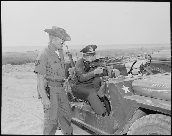 Keywords: U.S. Air Force MSgt Jack Cheek of the 635 Security Police Squadron instructs Royal Thai Air Force Captain Kumron... - NARA - 542309.tif Scope and content General notes 542309 Local identifier 342-AF-105184USAF Department of Defense Department of the Air Force 09/26/1947 - Still Picture Records Section Special Media Archives Services Division NWCS-S National Archives at College Park 8601 Adelphi Road College Park MD 20740-6001 03/1969 Record group Record Group 342 Records of U S Air Force Commands Activities and Organizations 1900 - 2003 Record group ARC 654 Black and White Photographs of U S Air Force and Predecessors' Activities Facilities and Personnel Domestic and Foreign compiled 1930 - 1975 documenting the period 1863 - 1975 Series ARC 542185 File unit File unit ARC Variant control numbers NAIL Control Number NWDNS-342-AF-105184USAF yes Other versions NARA-cooperation PD-USGov United States Air Force Security Forces Royal Thai Air Force M60 machine gun |