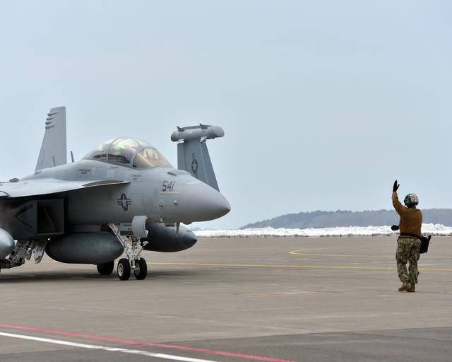 | Keywords: U.S. Navy Aviation Electronics Technician 2nd Class Danielle Murphy directs an EA-18G Growler aircraft attached to Electronic Attack Squadron (VAQ) 132 as it arrives at Naval Air Facility Misawa, Japan, Feb. 27 140227-N-DP652-014.jpg en U S Navy Aviation Electronics Technician 2nd Class Danielle Murphy directs an EA-18G Growler aircraft attached to Electronic Attack Squadron VAQ 132 as it arrives at Naval Air Facility Misawa Japan Feb 27 2014 The squadron was on a routine deployment in support of U S 7th Fleet operations 2014-02-27 MC3 Erin Devenberg http //www defenseimagery mil/imageRetrieve action guid ce6bdae06419588537b2a7fa1ee8427843bfc4ba t 2 Public domain photograph from defenseimagery mil http //www defenseimagery mil/imagery html guid ce6bdae06419588537b2a7fa1ee8427843bfc4ba 140227-N-DP652-014 2014-03-03 Naval Air Facility Misawa PD-USGov-Military-Navy Naval Air Facility Misawa Images from DoD uploaded by Fæ |
