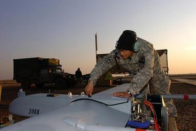 | Keywords: UAV Crews Help Keep 'Eye in the Skies' Over Baghdad DVIDS34402.jpg en Vega Alta Puerto Rico native Sgt Andy Crespo a generator mechanic for 1st Brigade Combat Team 1st Cavalry Division attached to Company E provisional 615th Aviation Support Battalion 1st Air Cavalry Brigade 1st CD readies a Shadow unmanned aerial vehicle for launch at the launch and recovery site located at Camp Taji Iraq 2006-12-24 Staff Sgt Nathan Hoskins https //www dvidshub net/image/34402 34402 2006-12-24 11 01 TAJI IQ PD-USGov 1st Cavalry Division United States Camp Taji Images from DoD uploaded by Fæ |