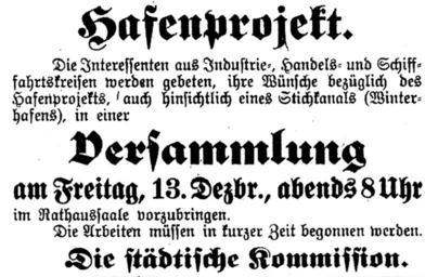 | Keywords: Uetersen Bekanntmachung Hafenprojekt 1918.jpg de Bekanntmachung über das Hafenbauprojekt Stichhafen in den Uetersener Nachrichten vom 11 Dezember 1912 eigene reproduktion das Original mehr als 70 Jahre alt own reproduktion original is more than 70 years old Author 1912-12-11 Pinnau Documents of Uetersen PD-old |