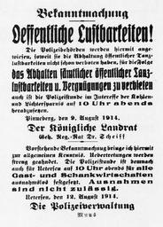 | Keywords: Uetersen Bekanntmachung Oeffentliche Lustbarkeiten Aug. 1914.jpg de Bekanntmachung Tanzverbot in den Uetersener Nachrichten 1914 eigene reproduktion das Original mehr als 70 Jahre alt own reproduktion original is more than 70 years old Author 1914 Germany in World War I Documents of Uetersen World War I PD-old |