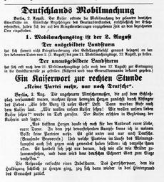 | Keywords: Uetersen Mobilmachung 1914.jpg de Extra-Ausgabe der Uetersener Nachrichten von Sonntag den 2 August 1914 Deutsche Mobilmachung eigene reproduktion das Original mehr als 70 Jahre alt own reproduktion original is more than 70 years old Author 1914-08-02 Germany in World War I Documents of Uetersen World War I PD-old |