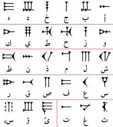 | Keywords: Ugaritic-alphabet-chart-Arabic.svg أبجدية أوغاريتية A table of the letters of the ancient Ugaritic cuneiform alphabet; under each Ugaritic letter is the letter of the Arabic alphabet which most closely corresponds to it The rows read from right to left Note that the modern pronunciation of the Arabic letter is not always exactly the same as the probable ancient pronunciation of the Ugaritic letter particularly in the case of Ugaritic g and Arabic <big>ج</big> only valid in Egyptian dialect and Ugaritic p and Arabic <big>ف</big> Also it is not known exactly how the Ugaritic emphatic sounds ṭ ṣ ẓ q ط ص ظ ق were distinguished in pronunciation from the corresponding non-emphatic sounds t s θ k ت س ث ك and the phonetic basis of emphasis contrasts in ancient Ugaritic could have been different from the phonetic basis of emphasis contrasts in modern Arabic The vertical red line in the last row of the table divides the basic 27 Ugaritic letters presumably adapted from an early non-Cuneiform alphabet from the last three letters which seem to have been added within Ugaritic originally to transcribe foreign words or languages The only punctuation was a word divider a short vertical stroke not shown in the table This is a self-made graphic based on fonts and publicly-available information declared to be in the public domain Ugaritic-alphabet-chart svg 2012-03 AnonMoos For a version of this table with Latin-alphabet transcriptions see File Ugaritic-alphabet-chart svg For a chart with somewhat different letter-shapes since based on a more tapering wedge and including the word-divider see File Ugaritic script sample svg 350px center Ugaritic letters Alphabet charts Tables with Arabic script typeset in SVG |