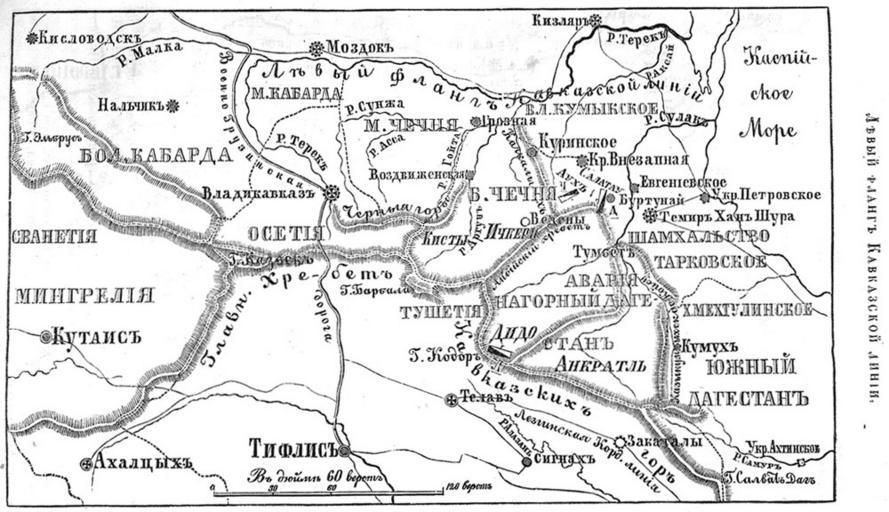 | Keywords: Ugrinovich. The left flank.jpg Кавказской линии буквами Ч Д и Л обозначены от яды Чеченский Дагестанский и Лезгинский; Имя аула Гумбет по ошибке г аве а г Рихау значится на ка те Тумбет Ка та из статьи Уг инович К К аткий обзо военных действий на Кавказе в минувшем 1857 году // Русский вестник - 1858 - 2 scan from www vostlit info http //www vostlit info/Texts/Dokumenty/Kavkaz/XIX/1840-1860/Ugrinovic/2 JPG link 1858 К Уг инович Russian fortified lines Maps of the Caucasus during the Caucasian War 1817 1864 PD-old |