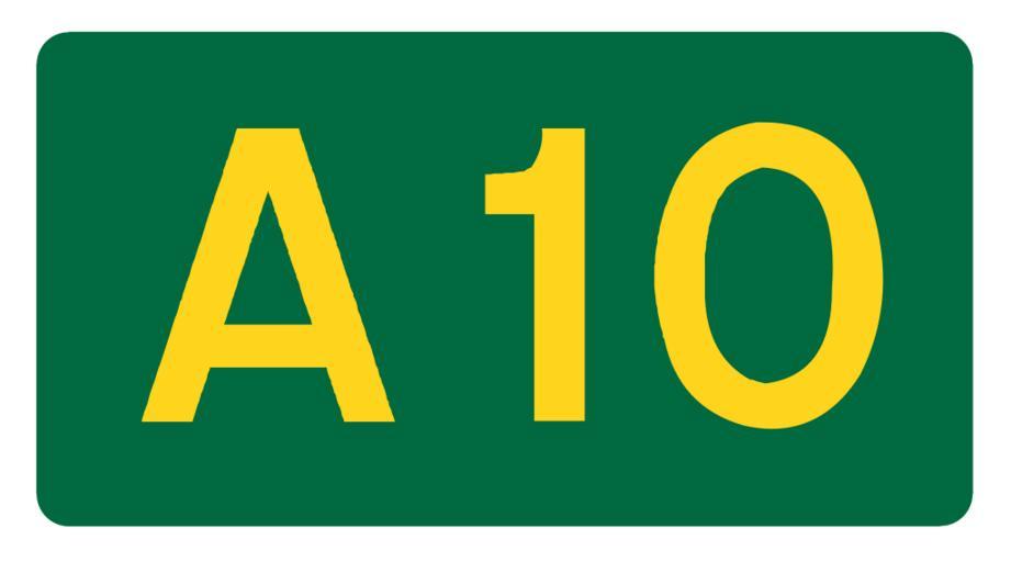 Keywords: UK road A10.svg en UK road number patch A10 own Mauls 2009-01 Diagrams of route signs of the United Kingdom 0010 Number 10 on highway signs A10 road England