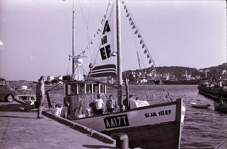 | Keywords: outdoor 40 år siden EF-avstemningen 1972:Folkeavstemningen om norsk medlemskap i EF 24. og 25. september 1972 ga som resultat at et flertall svarte nei til medlemskap. Ved avstemningen stemte 46,5 prosent ja og 53,5 prosent nei. Sommeren 1972 dro Ja-aksjonen langs Sørlandskysten med båt for å spre sitt budskap. Partene i valgkampen sto steilt mot hverandre og en SF-er kalte skipperen av Ja til EF-båten for ”prostituert fisker” og ”landsforræder” fordi han lånte ut sin båt til Ja-aksjonen. Her ligger båten til kai i Arendal. Arkivref: Riksarkivet, Pa 0797 – Billedbladet NÅ, 7375_3 40 år siden EF-avstemningen 1972:Folkeavstemningen om norsk medlemskap i EF 24. og 25. september 1972 ga som resultat at et flertall svarte nei til medlemskap. Ved avstemningen stemte 46,5 prosent ja og 53,5 prosent nei. Sommeren 1972 dro Ja-aksjonen langs Sørlandskysten med båt for å spre sitt budskap. Partene i valgkampen sto steilt mot hverandre og en SF-er kalte skipperen av Ja til EF-båten for ”prostituert fisker” og ”landsforræder” fordi han lånte ut sin båt til Ja-aksjonen. Her ligger båten til kai i Arendal. Arkivref: Riksarkivet, Pa 0797 – Billedbladet NÅ, 7375_3 |