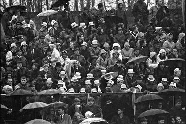 | Keywords: monochrome blackandwhite people crowd outdoor black and white Søndag er det cupfinale, og det bærer ukens favorittbilde preg av! Det er valgt ut av Alfhild Nakken, underdirektør i Seksjon for eldre arkiver og spesialsamlinger. ”Cupfinalen 1968 Bildet er tatt av Billedbladet NÅs fotograf under cupfinalen på Ullevaal stadion 27. oktober 1968. Bildet forteller om cupstemning i gråvær og regn. Tilskuernes påkledning og utstyr har endret seg mye siden da; her er menn med hatt og slips, supportere med hvite ”flosshatter” og kvinner med plastskaut over håret. Bildet kan stå som en hyllest til alle som gjennom årene har trosset vær og vind og møtt opp for å heie laget sitt fram til cupseier. Kommende søndag er det igjen cupfinale på Ullevaal. Årets finalister er som kjent Tromsø og Hødd. Det var ingen av dem som kunne heve pokalen i triumf i 1968, det gjorde derimot et tradisjonsrikt Oslo-lag, stiftet så tidlig som i 1896. Seks av spillerne på ”Bronselaget” i 1936 hørte hjemme i denne klubben. I 1968, og for første gang i norsk fotballhistorie, vant laget både serien og cupen. Helt riktig – laget var Lyn! De slo Mjøndalen 3-1 etter scoringer av tre av lagets mest profilerte spillere på denne tiden: Ola Dybwad-Olsen, Jan Berg og Harald Berg. Egentlig skulle jeg ha vist et bilde av en av disse spillerne eller av målene. Men i NÅ-arkivet ligger det ikke et eneste slikt bilde. Kanskje var fotografen Mjøndalen-supporter? I hvert fall ser vi en flokk med Mjøndalen-fans på tribunen. Lyn spilte cupfinale også i 1994 og 2004, men det endte med tap mot henholdsvis Molde og Brann. Fotballinteresserte vil ellers vite at Lyn har vært langt nede de siste årene. Men nå går det oppover! I år vant de sin avdeling i 3. divisjon overlegent og rykker opp til 2. divisjon neste sesong. Årets toppscorer med 30 mål er en nykommer som heter Birger Rasmussen. Han har litt å slekte på i Lyn-sammenheng: Onkelen, Ola Dybwad-Olsen, scoret i 1968 til sammen 39 mål på 25 kamper. Den rekorden står ennå!” Fotograf Jan van Deurs. Bildene var brukt i NÅ nr. 44, 1968. Arkivreferanse: Billedbladet NÅ, RA/PA-0797 4778_3_24 Søndag er det cupfinale, og det bærer ukens favorittbilde preg av! Det er valgt ut av Alfhild Nakken, underdirektør i Seksjon for eldre arkiver og spesialsamlinger. ”Cupfinalen 1968 Bildet er tatt av Billedbladet NÅs fotograf under cupfinalen på Ullevaal stadion 27. oktober 1968. Bildet forteller om cupstemning i gråvær og regn. Tilskuernes påkledning og utstyr har endret seg mye siden da; her er menn med hatt og slips, supportere med hvite ”flosshatter” og kvinner med plastskaut over håret. Bildet kan stå som en hyllest til alle som gjennom årene har trosset vær og vind og møtt opp for å heie laget sitt fram til cupseier. Kommende søndag er det igjen cupfinale på Ullevaal. Årets finalister er som kjent Tromsø og Hødd. Det var ingen av dem som kunne heve pokalen i triumf i 1968, det gjorde derimot et tradisjonsrikt Oslo-lag, stiftet så tidlig som i 1896. Seks av spillerne på ”Bronselaget” i 1936 hørte hjemme i denne klubben. I 1968, og for første gang i norsk fotballhistorie, vant laget både serien og cupen. Helt riktig – laget var Lyn! De slo Mjøndalen 3-1 etter scoringer av tre av lagets mest profilerte spillere på denne tiden: Ola Dybwad-Olsen, Jan Berg og Harald Berg. Egentlig skulle jeg ha vist et bilde av en av disse spillerne eller av målene. Men i NÅ-arkivet ligger det ikke et eneste slikt bilde. Kanskje var fotografen Mjøndalen-supporter? I hvert fall ser vi en flokk med Mjøndalen-fans på tribunen. Lyn spilte cupfinale også i 1994 og 2004, men det endte med tap mot henholdsvis Molde og Brann. Fotballinteresserte vil ellers vite at Lyn har vært langt nede de siste årene. Men nå går det oppover! I år vant de sin avdeling i 3. divisjon overlegent og rykker opp til 2. divisjon neste sesong. Årets toppscorer med 30 mål er en nykommer som heter Birger Rasmussen. Han har litt å slekte på i Lyn-sammenheng: Onkelen, Ola Dybwad-Olsen, scoret i 1968 til sammen 39 mål på 25 kamper. Den rekorden står ennå!” Fotograf Jan van Deurs. Bildene var brukt i NÅ nr. 44, 1968. Arkivreferanse: Billedbladet NÅ, RA/PA-0797 4778_3_24 |