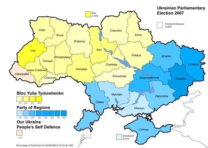 Keywords: Ukrainian parliamentary election 2007 (HighestVote).PNG Ukrainian Parliamentary Election 2007 Highest vote per region - percentage of total national vote H 30/60/200 S 25 B 100 Improved label alignment and cleaner graphics English Ukrainian parliamentary election 2007 own map by Muumi with data from http //www cvk gov ua/vnd2007/w6p001 html Central Election Commission of Ukraine 1 2008-02-11 User DemocracyATwork DemocracyATwork Image Ukrainian parliamentary election 2007 HighestVote - by electoral regions with shaded vote percentage Image Ukrainian parliamentary election 2007 PoR PNG - by electoral regions with shaded vote percentage per region Image Ukrainian parliamentary election 2007 BYuT PNG - by electoral regions with shaded vote percentage per region Image Ukrainian parliamentary election 2007 OU-PSD PNG - by electoral regions with shaded vote percentage per region Image Ukrainian parliamentary election 2007 CPU PNG - by electoral regions with shaded vote percentage per region Image Ukrainian parliamentary election 2007 BLP PNG - by electoral regions with shaded vote percentage per region Image Ukrainian parliamentary election 2007 SPU PNG - by electoral regions with shaded vote percentage per region Image Ukrainian parliamentary election 2007 Results PNG - by electoral regions with shaded vote percentage per region Image Ukrainian parliamentary election 2007 Vote PNG - by electoral regions with shaded vote percentage per region Image Ukrainian parliamentary election 2007 Swing PNG - by electoral regions with shaded vote percentage per region Maps of 2007 Ukrainian parliamentary election Maps created by DemocracyATwork Location not applicable Yulia Tymoshenko Bloc