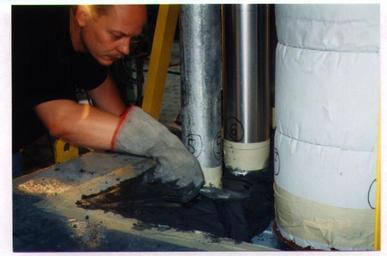 | Keywords: Ulc prueflingsaufbau.jpg Construction of a test sample consisting of a mock-up concrete floor frame complete with penetrants The concrete frame measures approximately 5' x 9' x 4 ca 1 5m x 2 3m x 10cm It has a large hole in the centre with many mechanical and electrical services traversing The penetrants extend 1' 30cm into the furnace and 3' 91cm on the unexposed side A firestop mortar is being applied here Notice the intumescent http //multimedia mmm com/mws/mediawebserver dyn 6666660Zjcf6lVs6EVs666lX3COrrrrQ- wrap strip surrounding the fibreglass pipe insulation When the fire starts this embedded intumescent will swell to take up the place of the melting insulation The test was conducted in accordance with the Canadian firestop test method http //www ulc ca/ ULC S-115 in Scarborough Ontario Own 2005-06-24 Achim Hering Firestop installation equipment Firestops being installed Firestop mortar Plumbing Pipes Cement Thermal insulation Fibreglass Men at work 3M Fire Barrier Mortar Pipe covering |