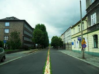 Keywords: Ulica Wileńska w Raciborzu 5.jpg pl Ulica Wileńska w Raciborzu Na zdjęciu widoczny tradycyjny dywan kwiatowy ułożony w Boże Ciało 2011-06-23 own Olos88 cc-zero Uploaded with UploadWizard Wileńska Street Racibórz