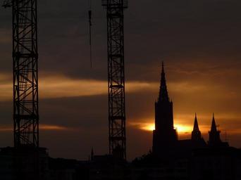 Keywords: ulm cathedral münster dom cathedral architecture building high church steeple sunset abendstimmung baukran crane construction sites build site construction work technology