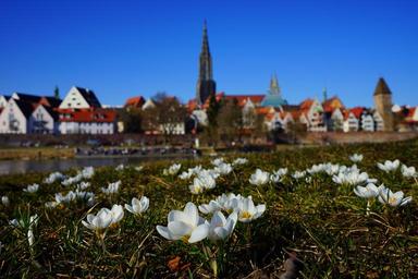 Keywords: ulm new ulm view outlook spring meadow crocus flowers white city wall downtown center city view ulm cathedral münster building dom city tower steeple church architecture cathedral old town places of interest metzgerturm