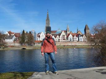 Keywords: ulm ulm cathedral city outlook city view münster view home homes sky church steeple roofs danube city panorama panorama spire city wall metzgerturm town home river water human man stand holiday photo memory