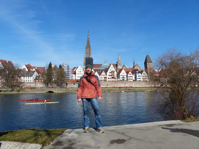 Keywords: ulm ulm cathedral danube water sports kayak city outlook city view münster view home homes sky church steeple roofs city panorama panorama spire city wall metzgerturm town home river water human man stand holiday photo memory