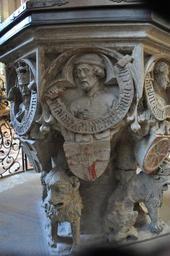 | Keywords: Ulmer Münster Taufstein Detail mit Wappen Trier.jpg Ulm Ulmer Münster Taufstein 1474 Detail Figur mit dem Wappen des Kurfürsten von Trier own 2013-11-11 Uli E Baptismal font of Ulm Minster Trier See coat of arms Reliefs of coats of arms in Ulm |