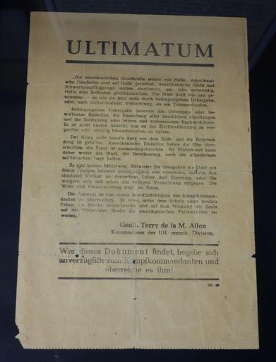 | Keywords: Ultimatum issued by General Terry de la M. Allen, World War II - Fort Devens Museum - DSC07173.JPG en Exhibit in the Fort Devens Museum 94 Jackson Road 305 Devens Massachusetts USA Photography was permitted in the museum without restriction 2013-06-07 10 46 44 own Daderot cc-zero Propaganda in the Fort Devens Museum Uploaded with UploadWizard Propaganda pamphlets | ||||