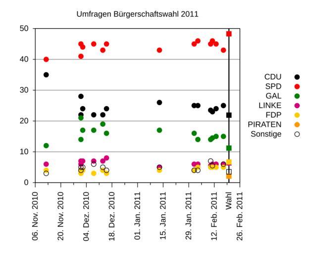 | Keywords: UmfrageHH2011.svg Gnuplot created SVG file of the poll history of the Hamburg election 2011 own MyName Sig11 <span class signature-talk >talk</span> Source code gnuplot <pre> Ausgabedatei und -format set output 'UmfrageHH2011 svg' set terminal svg Datumformat set locale 'de_DE UTF-8' set xdata time set timefmt d m Y set format x d b Y Titel set title 'Umfragen Bürgerschaftswahl 2011' Achsen und Gitternetz unset xlabel set xtics out nomirror rotate 1 autofreq scale 1 0 5 set ytics out nomirror scale 0 5 set grid ytics set yrange 0 50 Legende set key outside right center set label Wahl at '20 02 2011' -3 right rotate by 90 Plotten plot 'hh11 dat' using 1 2 lt -1 pt 7 title 'CDU' \ 'hh11 dat' using 1 3 lt 1 pt 7 title 'SPD' \ 'hh11 dat' using 1 4 lt 2 pt 7 title 'GAL' \ 'hh11 dat' using 1 5 lt 12 pt 7 title 'LINKE' \ 'hh11 dat' using 1 6 lt 11 pt 7 title 'FDP' \ '-' using '20 02 2011' 1 lt 7 pt 7 title 'PIRATEN' \ 'hh11 dat' using 1 7 lt -1 pt 6 title 'Sonstige' \ '-' using '20 02 2011' 1 with impulses lt -1 lw 2 notitle \ '-' using '20 02 2011' 1 lt -1 pt 5 notitle \ '-' using '20 02 2011' 1 lt 1 pt 5 notitle \ '-' using '20 02 2011' 1 lt 2 pt 5 notitle \ '-' using '20 02 2011' 1 lt 12 pt 5 notitle \ '-' using '20 02 2011' 1 lt 11 pt 5 notitle \ '-' using '20 02 2011' 1 lt 7 pt 5 notitle \ '-' using '20 02 2011' 1 lt -1 pt 4 notitle Dummy fuer die Erzeugung der Piraten in der Legende 70 e Dummy fuer die Erzeugung des Wahltermins 70 e Wahlergebnis CDU 21 9 e Wahlergebnis SPD 48 3 e Wahlergebnis GAL 11 2 e Wahlergebnis LINKE 6 4 e Wahlergebnis FDP 6 7 e Wahlergebnis PIRATEN 2 1 e Wahlergebnis Sonstige 3 5 e set output </pre> hh11 dat contains <pre> CDU SPD GAL LINKE FDP Sonstige 17 02 2011 25 43 15 6 5 6 13 02 2011 24 45 15 6 5 11 02 2011 23 46 14 5 6 5 5 5 10 02 2011 23 5 45 14 5 5 5 7 03 02 2011 25 46 14 6 5 4 01 02 2011 25 45 16 6 4 4 13 01 2011 26 43 17 5 4 5 15 12 2010 24 45 16 8 3 4 13 12 2010 22 43 19 7 4 5 08 12 2010 22 45 17 7 3 6 02 12 2010 24 44 17 7 4 5 01 12 2010 28 45 14 6 3 4 01 12 2010 22 41 21 7 4 5 12 11 2010 35 40 12 6 4 3 </pre> References http //www wahlrecht de/umfragen/landtage/hamburg htm Wahlrecht de for the poll results http //www statistik-nord de/wahlen/wahlen-in-hamburg/buergerschaftswahlen/2011/ Statistik Nord for the preliminary result of Feb 23 Specifically the file http //www statistik-nord de/uploads/tx_standocuments/INTBUEWA01 pdf INTBUEWA01 pdf Hamburgische Bürgerschaft election 2011 Umfragen |