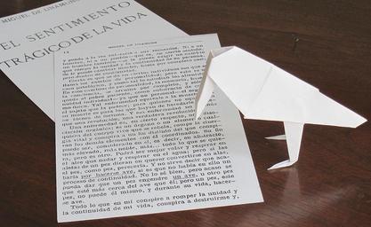 Keywords: Unamuno's pajaro sabio.jpg en Version of Unamuno's pájaro sabio wise bird looking at his most famous book own Alethe 2011/01/ 21 cc-by-sa-3 0 Origami artists Origami birds