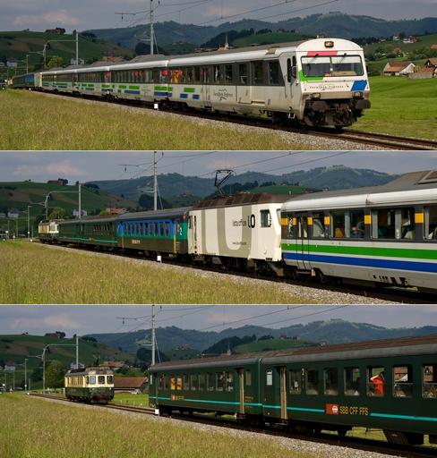 | Keywords: Ungekuppelter Schubdienst SOB.jpg  en Uncoupled BDe 4/4 electric multiple unit pushing and separating from the Voralpenexpress on the incline between Biberbrugg and Altmatt The Voralpenexpress normally only consists of the first five coaches and the white Re 456 locomotive; the three green coaches are supplemental coaches which make the train to heavy to be hauled by the Re 456 alone in the 5 grade de Ein ungekuppelter BDe 4/4-Triebwagen schiebt bzw trennt sich vom Voralpenexpress zwischen Biberbrugg und Altmatt Der Voralpenexpress besteht normalerweise nur aus den ersten fünf Waggons und der weissen Re 456; die drei günen Wagen sind Zusatzwagen die den Zug hier in 5 Steigung zu schwer machen als dass er von der Re 456 alleine befördert werden könnte own http //www bahnbilder ch/travelogue/49 Kabelleger / David Gubler http //www bahnbilder ch 2008-06-19 Rail vehicles of Südostbahn and predecessors Bahnbilder ch SLM Re 456 KTU BDe 4/4 Voralpen-Express Advertisements on locomotives of Switzerland |