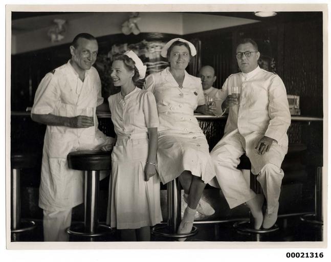 Keywords: samuel j hood collection samueljhoodcollection hood collection hoodcollection dutch tss oranje ii tssoranjeii oranje hospital ship hospitalship world war ii worldwarii wwii nurses medical personnel medicalpersonnel war robert menzies robertmenzies red cross redcross dutch netherlands indies government dutchnetherlandsindiesgovernment major-general hein ter poorten majorgeneralheinterpoorten poorten cockatoo island cockatooisland cockatoo island dockyards cockatooislanddockyards groupshot people photo border This photograph depicts unidentified medical personnel on board TSS ORANJE II drinking at a bar. On 28 June 1941, after a refitting at Cockatoo dock, Australia's Prime Minister Robert Menzies hoisted a Red Cross flag on the Dutch liner TSS ORANJE. The ceremony marked the handing over of the vessel from the Dutch Netherlands Indies Government to the Australian and New Zealand Governments to be used as a hospital ship. This photo is part of the Australian National Maritime Museum’s Samuel J. Hood Studio collection. Sam Hood (1872-1953) was a Sydney photographer with a passion for ships. His 60-year career spanned the romantic age of sail and two world wars. The photos in the collection were taken mainly in Sydney and Newcastle during the first half of the 20th century. The ANMM undertakes research and accepts public comments that enhance the information we hold about images in our collection. This record has been updated accordingly. Photographer: Samuel J. Hood Studio Collection Object no. 00021316 This photograph depicts unidentified medical personnel on board TSS ORANJE II drinking at a bar. On 28 June 1941, after a refitting at Cockatoo dock, Australia's Prime Minister Robert Menzies hoisted a Red Cross flag on the Dutch liner TSS ORANJE. The ceremony marked the handing over of the vessel from the Dutch Netherlands Indies Government to the Australian and New Zealand Governments to be used as a hospital ship. This photo is part of the Australian National Maritime Museum’s Samuel J. Hood Studio collection. Sam Hood (1872-1953) was a Sydney photographer with a passion for ships. His 60-year career spanned the romantic age of sail and two world wars. The photos in the collection were taken mainly in Sydney and Newcastle during the first half of the 20th century. The ANMM undertakes research and accepts public comments that enhance the information we hold about images in our collection. This record has been updated accordingly. Photographer: Samuel J. Hood Studio Collection Object no. 00021316