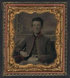 | Keywords: library of congress libraryofcongress dc:identifier=http://hdl.loc.gov/loc.pnp/ppmsca.27233 dc:identifier=httphdllocgovlocpnpppmsca27233 xmlns:dc=http://purl.org/dc/elements/1.1/ xmlns:dc=httppurlorgdcelements11 people picture frame photo border [Unidentified soldier in Union uniform in front of painted backdrop showing porch and terrace] [between 1861 and 1865] 1 photograph : sixth-plate tintype, hand-colored ; 9.2 x 8.1 cm (case) Notes: Title devised by Library staff. Case: Leather geometric. Photograph shows red piping painted on the uniform designating artillery. Gift; Tom Liljenquist; 2010; (DLC/PP-2010:105). Subjects: United States.--Army--People--1860-1870. Soldiers--Union--1860-1870. Military uniforms--Union--1860-1870. Backdrops--1860-1870. United States--History--Civil War, 1861-1865--Military personnel--Union. Format: Portrait photographs--1860-1870. Tintypes--Hand-colored--1860-1870. Rights Info: No known restrictions on publication. Repository: Library of Congress, Prints and Photographs Division, Washington, D.C. 20540 USA, hdl.loc.gov/loc.pnp/pp.print Part Of: Ambrotype/Tintype filing series (Library of Congress) (DLC) 2010650518 Liljenquist Family collection (Library of Congress) (DLC) 2010650519 More information about this collection is available at hdl.loc.gov/loc.pnp/pp.lilj Persistent URL: hdl.loc.gov/loc.pnp/ppmsca.27233 Call Number: AMB/TIN no. 2371 [Unidentified soldier in Union uniform in front of painted backdrop showing porch and terrace] [between 1861 and 1865] 1 photograph : sixth-plate tintype, hand-colored ; 9.2 x 8.1 cm (case) Notes: Title devised by Library staff. Case: Leather geometric. Photograph shows red piping painted on the uniform designating artillery. Gift; Tom Liljenquist; 2010; (DLC/PP-2010:105). Subjects: United States.--Army--People--1860-1870. Soldiers--Union--1860-1870. Military uniforms--Union--1860-1870. Backdrops--1860-1870. United States--History--Civil War, 1861-1865--Military personnel--Union. Format: Portrait photographs--1860-1870. Tintypes--Hand-colored--1860-1870. Rights Info: No known restrictions on publication. Repository: Library of Congress, Prints and Photographs Division, Washington, D.C. 20540 USA, hdl.loc.gov/loc.pnp/pp.print Part Of: Ambrotype/Tintype filing series (Library of Congress) (DLC) 2010650518 Liljenquist Family collection (Library of Congress) (DLC) 2010650519 More information about this collection is available at hdl.loc.gov/loc.pnp/pp.lilj Persistent URL: hdl.loc.gov/loc.pnp/ppmsca.27233 Call Number: AMB/TIN no. 2371 |