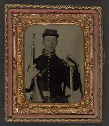 | Keywords: library of congress libraryofcongress dc:identifier=http://hdl.loc.gov/loc.pnp/ppmsca.26969 dc:identifier=httphdllocgovlocpnpppmsca26969 xmlns:dc=http://purl.org/dc/elements/1.1/ xmlns:dc=httppurlorgdcelements11 soldiersnpm picture frame people photo border [Unidentified soldier in Union cavalry uniform with percussion cap pistol carbine, attached stock, and cavalry saber] [between 1861 and 1865] 1 photograph : ninth-plate ambrotype, hand-colored ; 7.4 x 6.1 cm (case) Notes: Title devised by Library staff. Case: Leather scroll. Gift; Tom Liljenquist; 2010; (DLC/PP-2010:105). Subjects: United States.--Army--People--1860-1870. Soldiers--Union--1860-1870. Military uniforms--Union--1860-1870. Handguns--1860-1870. Daggers & swords--1860-1870. United States--History--Civil War, 1861-1865--Military personnel--Union. Format: Portrait photographs--1860-1870. Ambrotypes--Hand-colored--1860-1870. Rights Info: No known restrictions on publication. Repository: Library of Congress, Prints and Photographs Division, Washington, D.C. 20540 USA, hdl.loc.gov/loc.pnp/pp.print Part Of: Ambrotype/Tintype filing series (Library of Congress) (DLC) 2010650518 Liljenquist Family collection (Library of Congress) (DLC) 2010650519 More information about this collection is available at hdl.loc.gov/loc.pnp/pp.lilj Persistent URL: hdl.loc.gov/loc.pnp/ppmsca.26969 Call Number: AMB/TIN no. 2117 [Unidentified soldier in Union cavalry uniform with percussion cap pistol carbine, attached stock, and cavalry saber] [between 1861 and 1865] 1 photograph : ninth-plate ambrotype, hand-colored ; 7.4 x 6.1 cm (case) Notes: Title devised by Library staff. Case: Leather scroll. Gift; Tom Liljenquist; 2010; (DLC/PP-2010:105). Subjects: United States.--Army--People--1860-1870. Soldiers--Union--1860-1870. Military uniforms--Union--1860-1870. Handguns--1860-1870. Daggers & swords--1860-1870. United States--History--Civil War, 1861-1865--Military personnel--Union. Format: Portrait photographs--1860-1870. Ambrotypes--Hand-colored--1860-1870. Rights Info: No known restrictions on publication. Repository: Library of Congress, Prints and Photographs Division, Washington, D.C. 20540 USA, hdl.loc.gov/loc.pnp/pp.print Part Of: Ambrotype/Tintype filing series (Library of Congress) (DLC) 2010650518 Liljenquist Family collection (Library of Congress) (DLC) 2010650519 More information about this collection is available at hdl.loc.gov/loc.pnp/pp.lilj Persistent URL: hdl.loc.gov/loc.pnp/ppmsca.26969 Call Number: AMB/TIN no. 2117 |