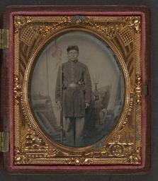 | Keywords: library of congress libraryofcongress dc:identifier=http://hdl.loc.gov/loc.pnp/ppmsca.26978 dc:identifier=httphdllocgovlocpnpppmsca26978 xmlns:dc=http://purl.org/dc/elements/1.1/ xmlns:dc=httppurlorgdcelements11 u.s. civil war uscivilwar american civil war americancivilwar the civil war thecivilwar civil war civilwar war between the states warbetweenthestates united states of america unitedstatesofamerica u.s.a. usa the union theunion union the north thenorth yankee yankees soldier musket bayonet revolver gun pistol people picture frame round photo border indoor [Unidentified soldier in Union uniform with musket, bayonet in scabbard, revolver, and cap box in front of painted backdrop showing military camp scene] [between 1861 and 1865] 1 photograph : sixth-plate tintype, hand-colored ; 9.5 x 8.3 cm (case) Notes: Title devised by Library staff. Case: Berg, no. 3-156. Photograph case has a medal with a portrait of Abraham Lincoln dated 1860 attached to interior. Gift; Tom Liljenquist; 2010; (DLC/PP-2010:105). Purchased from: Stone Mountain Relics, Inc., Stone Mountain, Georgia, 2002. Subjects: Lincoln, Abraham,--1809-1865--Associated objects. United States.--Army--People--1860-1870. Soldiers--Union--1860-1870. Military uniforms--Union--1860-1870. Rifles--1860-1870. Bayonets--Union--1860-1870. Handguns--Union--1860-1870. United States--History--Civil War, 1861-1865--Military personnel--Union. Format: Portrait photographs--1860-1870. Tintypes--Hand-colored--1860-1870. Rights Info: No known restrictions on publication. Repository: Library of Congress, Prints and Photographs Division, Washington, D.C. 20540 USA, hdl.loc.gov/loc.pnp/pp.print Part Of: Ambrotype/Tintype filing series (Library of Congress) (DLC) 2010650518 Liljenquist Family collection (Library of Congress) (DLC) 2010650519 More information about this collection is available at hdl.loc.gov/loc.pnp/pp.lilj Persistent URL: hdl.loc.gov/loc.pnp/ppmsca.26978 Call Number: AMB/TIN no. 2126 [Unidentified soldier in Union uniform with musket, bayonet in scabbard, revolver, and cap box in front of painted backdrop showing military camp scene] [between 1861 and 1865] 1 photograph : sixth-plate tintype, hand-colored ; 9.5 x 8.3 cm (case) Notes: Title devised by Library staff. Case: Berg, no. 3-156. Photograph case has a medal with a portrait of Abraham Lincoln dated 1860 attached to interior. Gift; Tom Liljenquist; 2010; (DLC/PP-2010:105). Purchased from: Stone Mountain Relics, Inc., Stone Mountain, Georgia, 2002. Subjects: Lincoln, Abraham,--1809-1865--Associated objects. United States.--Army--People--1860-1870. Soldiers--Union--1860-1870. Military uniforms--Union--1860-1870. Rifles--1860-1870. Bayonets--Union--1860-1870. Handguns--Union--1860-1870. United States--History--Civil War, 1861-1865--Military personnel--Union. Format: Portrait photographs--1860-1870. Tintypes--Hand-colored--1860-1870. Rights Info: No known restrictions on publication. Repository: Library of Congress, Prints and Photographs Division, Washington, D.C. 20540 USA, hdl.loc.gov/loc.pnp/pp.print Part Of: Ambrotype/Tintype filing series (Library of Congress) (DLC) 2010650518 Liljenquist Family collection (Library of Congress) (DLC) 2010650519 More information about this collection is available at hdl.loc.gov/loc.pnp/pp.lilj Persistent URL: hdl.loc.gov/loc.pnp/ppmsca.26978 Call Number: AMB/TIN no. 2126 |