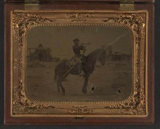 | Keywords: library of congress libraryofcongress dc:identifier=http://hdl.loc.gov/loc.pnp/ppmsca.27528 dc:identifier=httphdllocgovlocpnpppmsca27528 xmlns:dc=http://purl.org/dc/elements/1.1/ xmlns:dc=httppurlorgdcelements11 picture frame photo border [Unidentified soldier in Union uniform atop horse blowing bugle while unsheathing sword] [between 1861 and 1865] 1 photograph : quarter-plate tintype, hand-colored ; 9.9 x 12.5 cm (case) Notes: Title devised by Library staff. Case: (front) Berg, no. 1-22; (back) Berg, no. 3-17. Gift; Tom Liljenquist; 2010; (DLC/PP-2010:105). Purchased from: The Horse Soldier, Gettysburg, Pennsylvania, 2002. Published in: Davis, William C. Rebels & yankees: The fighting men of the Civil War. London, England: Salamander Books Limited, 1999, p. 47. Subjects: United States.--Army--People--1860-1870. Soldiers--Union--1860-1870. Military uniforms--Union--1860-1870. Horses--1860-1870. Daggers & swords--1860-1870. Bugles--1860-1870. Musicians--1860-1870. United States--History--Civil War, 1861-1865--Military personnel--Union. Format: Portrait photographs--1860-1870. Tintypes--Hand-colored--1860-1870. Rights Info: No known restrictions on publication. Repository: Library of Congress, Prints and Photographs Division, Washington, D.C. 20540 USA, hdl.loc.gov/loc.pnp/pp.print Part Of: Ambrotype/Tintype filing series (Library of Congress) (DLC) 2010650518 Liljenquist Family collection (Library of Congress) (DLC) 2010650519 More information about this collection is available at hdl.loc.gov/loc.pnp/pp.lilj Persistent URL: hdl.loc.gov/loc.pnp/ppmsca.27528 Call Number: AMB/TIN no. 5019 [Unidentified soldier in Union uniform atop horse blowing bugle while unsheathing sword] [between 1861 and 1865] 1 photograph : quarter-plate tintype, hand-colored ; 9.9 x 12.5 cm (case) Notes: Title devised by Library staff. Case: (front) Berg, no. 1-22; (back) Berg, no. 3-17. Gift; Tom Liljenquist; 2010; (DLC/PP-2010:105). Purchased from: The Horse Soldier, Gettysburg, Pennsylvania, 2002. Published in: Davis, William C. Rebels & yankees: The fighting men of the Civil War. London, England: Salamander Books Limited, 1999, p. 47. Subjects: United States.--Army--People--1860-1870. Soldiers--Union--1860-1870. Military uniforms--Union--1860-1870. Horses--1860-1870. Daggers & swords--1860-1870. Bugles--1860-1870. Musicians--1860-1870. United States--History--Civil War, 1861-1865--Military personnel--Union. Format: Portrait photographs--1860-1870. Tintypes--Hand-colored--1860-1870. Rights Info: No known restrictions on publication. Repository: Library of Congress, Prints and Photographs Division, Washington, D.C. 20540 USA, hdl.loc.gov/loc.pnp/pp.print Part Of: Ambrotype/Tintype filing series (Library of Congress) (DLC) 2010650518 Liljenquist Family collection (Library of Congress) (DLC) 2010650519 More information about this collection is available at hdl.loc.gov/loc.pnp/pp.lilj Persistent URL: hdl.loc.gov/loc.pnp/ppmsca.27528 Call Number: AMB/TIN no. 5019 |