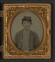 | Keywords: library of congress libraryofcongress dc:identifier=http://hdl.loc.gov/loc.pnp/ppmsca.27189 dc:identifier=httphdllocgovlocpnpppmsca27189 xmlns:dc=http://purl.org/dc/elements/1.1/ xmlns:dc=httppurlorgdcelements11 u.s. civil war uscivilwar american civil war americancivilwar the civil war thecivilwar civil war civilwar war between the states warbetweenthestates united states of america unitedstatesofamerica u.s.a. usa the union theunion union the north thenorth yankee yankees soldier zouaves zouave union zouave unionzouave people picture frame photo border round indoor [Unidentified young soldier in Union Zouave uniform] [between 1861 and 1865] 1 photograph : sixth-plate tintype, hand-colored ; 9.6 x 8.4 cm (case) Notes: Title devised by Library staff. Case: Berg, no. 2-35. Gift; Tom Liljenquist; 2010; (DLC/PP-2010:105). Purchased from: Medhurst & Co., Kansas City, Kansas, 2008. Subjects: United States.--Army--People--1860-1870. Soldiers--Union--1860-1870. Military uniforms--Union--1860-1870. Zouaves--1860-1870. United States--History--Civil War, 1861-1865--Military personnel--Union. Format: Portrait photographs--1860-1870. Tintypes--Hand-colored--1860-1870. Rights Info: No known restrictions on publication. Repository: Library of Congress, Prints and Photographs Division, Washington, D.C. 20540 USA, hdl.loc.gov/loc.pnp/pp.print Part Of: Ambrotype/Tintype filing series (Library of Congress) (DLC) 2010650518 Liljenquist Family collection (Library of Congress) (DLC) 2010650519 More information about this collection is available at hdl.loc.gov/loc.pnp/pp.lilj Persistent URL: hdl.loc.gov/loc.pnp/ppmsca.27189 Call Number: AMB/TIN no. 2336 [Unidentified young soldier in Union Zouave uniform] [between 1861 and 1865] 1 photograph : sixth-plate tintype, hand-colored ; 9.6 x 8.4 cm (case) Notes: Title devised by Library staff. Case: Berg, no. 2-35. Gift; Tom Liljenquist; 2010; (DLC/PP-2010:105). Purchased from: Medhurst & Co., Kansas City, Kansas, 2008. Subjects: United States.--Army--People--1860-1870. Soldiers--Union--1860-1870. Military uniforms--Union--1860-1870. Zouaves--1860-1870. United States--History--Civil War, 1861-1865--Military personnel--Union. Format: Portrait photographs--1860-1870. Tintypes--Hand-colored--1860-1870. Rights Info: No known restrictions on publication. Repository: Library of Congress, Prints and Photographs Division, Washington, D.C. 20540 USA, hdl.loc.gov/loc.pnp/pp.print Part Of: Ambrotype/Tintype filing series (Library of Congress) (DLC) 2010650518 Liljenquist Family collection (Library of Congress) (DLC) 2010650519 More information about this collection is available at hdl.loc.gov/loc.pnp/pp.lilj Persistent URL: hdl.loc.gov/loc.pnp/ppmsca.27189 Call Number: AMB/TIN no. 2336 |