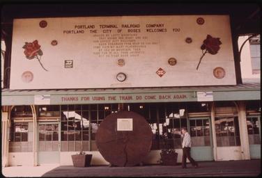 | Keywords: UNION STATION SIGN AT THE PORTLAND, OREGON, TERMINAL WELCOMES TRAVELERS TO THE CITY OF ROSES. THIS STATION IS ONE OF... - NARA - 556130.jpg Scope and content General notes <br /> Sign text Portland Terminal Railroad Company<br />Portland the City of Roses Welcomes You<br />Graced by lofty mountians that guard her night and day Our lovely city welcomes each stranger from near or far away Come view my many playgrounds by sea or mountain Then Have fun in all your journeys but do come back again Thanks for using the train Do come back again 556130 Local identifier 412-DA-13678 Environmental Protection Agency 12/02/1970 - NARA-Author O'Rear Charles 1941- Photographer 3403717 <br /> Still Picture Records Section Special Media Archives Services Division NWCS-S National Archives at College Park 8601 Adelphi Road College Park MD 20740-6001 07/1974 Record group Record Group 412 Records of the Environmental Protection Agency 1944 - 2006 Record group ARC 708 DOCUMERICA The Environmental Protection Agency's Program to Photographically Document Subjects of Environmental Concern compiled 1972 - 1977 Series ARC 542493 File unit File unit ARC Variant control numbers Agency-Assigned Identifier 228/58/013678<br /> NAIL Control Number NWDNS-412-DA-13678 Other versions <gallery> File UNION_STATION_SIGN_AT_THE_PORTLAND _OREGON _TERMINAL_WELCOMES_TRAVELERS_TO_THE_CITY_OF_ROSES _THIS_STATION_IS_ONE_OF _-_NARA_-_556130 tif tif File UNION_STATION_SIGN_AT_THE_PORTLAND _OREGON _TERMINAL_WELCOMES_TRAVELERS_TO_THE_CITY_OF_ROSES _THIS_STATION_IS_ONE_OF _-_NARA_-_556130 jpg jpg </gallery> NARA-cooperation PD-USGov Union Station Portland Train station signs in the United States |
