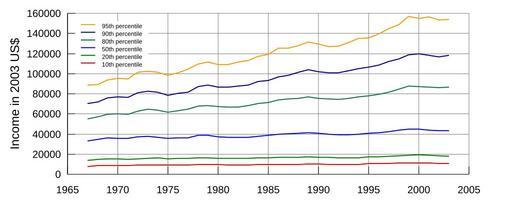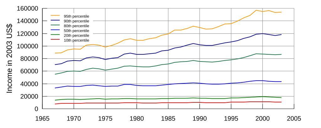 | Keywords: United States Income Distribution 1967-2003.svg Distribution of household income in the United States of America from 1967 through 2003 Numbers are normalized to 2003 United States dollars The data source is cite web http //www census gov/prod/2004pubs/p60-226 pdf Table A-3 Selected Measures of Household Income Dispersion 1967 to 2003 2007-06-16 2004 08 DeNavas-Walt Carmen Bernadette D Proctor Robert J Mills PDF Income Poverty and Health Insurance Coverage in the United States 2003 U S Census Bureau 36 “37 This image is intended to replace en File Income 1967 jpg with an SVG version This work is entirely my own built using gnuplot 4 0 I relinquish any and all copyright claims I might have releasing the work into the public domain The data file entitled income-distribution-data is as follows Income Poverty and Health Insurance Coverage in the United States 2003 Carmen DeNavas-Walt Bernadette D Proctor Robert J Mills August 2004 U S Census Bureau U S Department of Commerce Table A-3 Selected Measures of Household Income Dispersion 1967 to 2003 pages 36-37 Household Income at Selected Percentiles Percentile median Year 10th 20th 50th 80th 90th 95th 1967 7790 14002 33338 55265 70443 88678 1968 8472 14912 34746 56937 71799 89076 1969 8600 15369 36074 59772 76117 93743 1970 8435 15126 35832 60148 76719 95090 1971 8446 14927 35463 59708 76599 94818 1972 9009 15434 36953 62878 80793 101215 1973 9314 15844 37700 64500 82360 102243 1974 9401 16064 36537 63477 81577 101433 1975 9125 15143 35559 61765 78652 98484 1976 9168 15615 36155 63247 80701 100839 1977 9259 15573 36359 64564 81742 104377 1978 9745 16398 38693 67874 87110 109348 1979 9589 16457 38649 68318 88588 111445 1980 9515 15977 37447 67028 86692 108894 1981 9280 15772 36868 66878 86401 108822 1982 9216 15548 36811 66920 87717 111516 1983 9167 15769 36593 68154 88712 113187 1984 9542 16175 37767 70092 92299 117253 1985 9583 16306 38510 71433 93483 119459 1986 9526 16586 39868 73853 97043 125264 1987 9452 16724 40357 74893 98333 125321 1988 9817 17006 40678 75593 101339 127958 1989 10315 17329 41411 76946 103865 131443 1990 9965 17059 40865 75341 101857 129307 1991 9776 16580 39679 74759 100833 126969 1992 9655 16190 39364 74533 101023 127230 1993 9635 16256 39165 75594 103010 131178 1994 9914 16484 39613 77154 104890 134835 1995 10501 17261 40845 78061 106436 135448 1996 10474 17239 41431 79395 108450 139541 1997 10588 17601 42294 81719 112241 144636 1998 10979 18164 43825 84529 114396 148995 1999 11420 18915 44922 87459 118969 156744 2000 11304 19142 44853 87341 119636 155121 2001 11105 18674 43882 86771 118080 156395 2002 10863 18326 43381 85941 116726 153438 2003 10536 17984 43318 86867 118200 154120 The command file entitled commands is as follow set terminal svg size 1000 400 fname Arial fsize 20 enhanced set grid back lw 1 set logscale y set format y 6 0f set yrange 5000 200000 set ytics nomirror 5000 2 200000 set xtics nomirror set key rmargin Left reverse width 0 spacing 0 8 samplen 1 set ylabel Income in 2003 US font Arial 24 set size ratio 0 4 Skipping linetype lt 4; it's cyan and not very dark against white backgrounds plot income-distribution-data using 1 7 with lines lw 2 lt 7 title 95th percentile income-distribution-data using 1 6 with lines lw 2 lt 6 title 90th percentile income-distribution-data using 1 5 with lines lw 2 lt 5 title 80th percentile income-distribution-data using 1 4 with lines lw 2 lt 3 title 50th percentile income-distribution-data using 1 3 with lines lw 2 lt 2 title 20th percentile income-distribution-data using 1 2 with lines lw 2 lt 1 title 10th percentile The output was generated with gnuplot < commands > out svg 2007-06-16 en wikipedia SreeBot Alan De Smet at en wikipedia Alan De Smet Original upload log page en wikipedia United_States_Income_Distribution_1967-2003 svg Upload date User Bytes Dimensions Comment 2011-02-17 05 11 UTC Gwydion5 13998 bytes 1000×400 <small><nowiki>Reverted to version as of 22 53 3 January 2010</nowiki></small> 2010-01-04 10 29 UTC Ariel 17477 bytes 1000×400 <small><nowiki>Please see talk page for this file </nowiki></small> 2010-01-03 22 53 UTC Alan De Smet 13998 bytes 1000×400 <small><nowiki>Revert last; there is no particular reason linear scale is misleading </nowiki></small> 2010-01-03 22 25 UTC Ariel 17477 bytes 1000×400 <small><nowiki>Convert to logarithmic scale Linear scale is very misleading for this graph </nowiki></small> 2007-06-16 17 09 UTC Alan De Smet 13998 bytes 1000×400 <small><nowiki>Fix wonky overlarge key box </nowiki></small> 2007-06-16 17 02 UTC Alan De Smet 14015 bytes 0×0 <small><nowiki>Make legend bigger</nowiki></small> 2007-06-16 16 58 UTC Alan De Smet 14128 bytes 0×0 <small><nowiki>Correct labelling </nowiki></small> 2007-06-16 16 44 UTC Alan De Smet 14130 bytes 0×0 <small><nowiki>Minor tweak to last hoping to fix aspect ratio problem </nowiki></small> 2007-06-16 16 41 UTC Alan De Smet 14104 bytes 0×0 <small><nowiki>Distribution of income in the United States of America from 1967 through 2003 The data source is cite web http //www census gov/prod/2004pubs/p60-226 pdf Table A-3 Selected Measures of Household Income Dispersion 1967 to 2003 </nowiki></small> Income distribution in the United States |