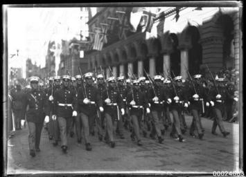 | Keywords: united states navy unitedstatesnavy us navy usnavy us navy visit usnavyvisit military personnel militarypersonnel march sydney samuel j hood collection samueljhoodcollection hood collection hoodcollection 1925 goodwill tour goodwilltour naval officers navalofficers naval visit navalvisit american fleet visit americanfleetvisit american navy americannavy admiral samuel shelburne robison admiralsamuelshelburnerobison admiral ss robison admiralssrobison gpo martin place martinplace united states marine corps unitedstatesmarinecorps us marine corps usmarinecorps united states marines unitedstatesmarines us marines usmarines marines usmc marine corps marinecorps rifle rifles m1903 springfield rifle m1903springfieldrifle m1903 springfield m1903springfield m1903 springfield rifle springfieldrifle model 1903 springfield model1903springfield blackandwhite monochrome photo border outdoor black and white On 23 July 1925, Sydney hosted eight of the US Navy Battle Fleet's largest ships, including USS CALIFORNIA, USS COLORADO, USS TENNESSEE, USS MARYLAND, USS WEST VIRGINIA, USS NEW MEXICO, USS MISSISSIPPI and USS IDAHO. On the day of their arrival, 2,000 officers took part in the march from Woolloomooloo wharf through the city and back to the wharf. On 24 July, 'The Sydney Morning Herald' reported that thousands of people gathered at every vantage point throughout the city to catch a glimpse of the American visitors. Captain Hepburn, commander of USS WEST VIRGINIA, led the parade through the streets of Sydney. This photo is part of the Australian National Maritime Museum’s Samuel J. Hood Studio collection. Sam Hood (1872-1953) was a Sydney photographer with a passion for ships. His 60-year career spanned the romantic age of sail and two world wars. The photos in the collection were taken mainly in Sydney and Newcastle during the first half of the 20th century. The ANMM undertakes research and accepts public comments that enhance the information we hold about images in our collection. This record has been updated accordingly. Photographer: Samuel J. Hood Studio Collection Object no. 00024683 On 23 July 1925, Sydney hosted eight of the US Navy Battle Fleet's largest ships, including USS CALIFORNIA, USS COLORADO, USS TENNESSEE, USS MARYLAND, USS WEST VIRGINIA, USS NEW MEXICO, USS MISSISSIPPI and USS IDAHO. On the day of their arrival, 2,000 officers took part in the march from Woolloomooloo wharf through the city and back to the wharf. On 24 July, 'The Sydney Morning Herald' reported that thousands of people gathered at every vantage point throughout the city to catch a glimpse of the American visitors. Captain Hepburn, commander of USS WEST VIRGINIA, led the parade through the streets of Sydney. This photo is part of the Australian National Maritime Museum’s Samuel J. Hood Studio collection. Sam Hood (1872-1953) was a Sydney photographer with a passion for ships. His 60-year career spanned the romantic age of sail and two world wars. The photos in the collection were taken mainly in Sydney and Newcastle during the first half of the 20th century. The ANMM undertakes research and accepts public comments that enhance the information we hold about images in our collection. This record has been updated accordingly. Photographer: Samuel J. Hood Studio Collection Object no. 00024683 |
