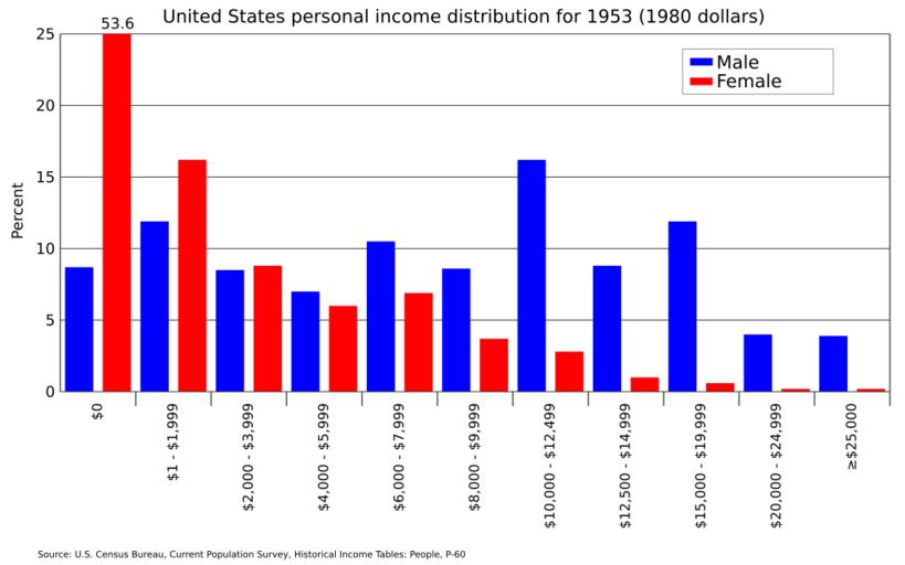 | Keywords: United States personal income by sex in 1980 dollars-1953.svg translate yes en Distribution of personal income by sex in the United States in 1953 in 1980 dollars Source U S Census Bureau Current Population Survey Historical Income People https //www2 census gov/prod2/popscan/p60-132 pdf P-60 Table 44 pgs 138-140 2016-05-05 own Delphi234 other versions Note wikitable - 1980 dollars 2014 dollars - 2 000 5 746 - 4 000 11 492 - 6 000 17 238 - 8 000 22 984 - 10 000 28 730 - 12 500 35 913 - 15 000 43 095 - 20 000 57 460 - 25 000 71 825 cc-zero Income distribution in the United States Personal income in the United States |