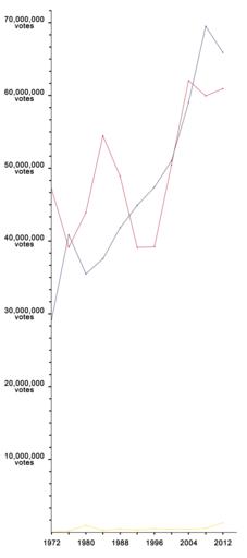 | Keywords: United States presidential election raw popular vote count line graph.png Key FFD900 Libertarian Party 1px AAAAAA solid 3C3B6E Democratic Party 1px AAAAAA solid B22234 Republican Party 1px AAAAAA solid Notes <p>Although the Libertarian Party was on the ballot in all fifty United States plus D C in 2000 the Libertarian Party of Arizona due to a conflict with the national party opted to place L Neil Smith on the ballot in place of the national party's nominee Harry Browne The 5 775 votes received by Smith are included in the party's 2000 total <p>In 2008 the Libertarian Party of New Hampshire had two presidential candidates on the ballot Bob Barr and George Phillies The 531 votes received by Phillies are included in the party's 2008 total alexpeak com 22 March 2016 allixpeeke 200px Bar graph 350px Expanded bar graph 175px Expanded line graph Cc-zero United States presidential election statistics United States presidential election 1972 United States presidential election 1976 United States presidential election 1980 United States presidential election 1984 United States presidential election 1988 United States presidential election 1992 United States presidential election 1996 United States presidential election 2000 United States presidential election 2004 United States presidential election 2008 Libertarian Party presidential graphs United States Libertarian Party 1972 presidential campaign United States Libertarian Party 1976 presidential campaign United States Libertarian Party 1980 presidential campaign United States Libertarian Party 1984 presidential campaign United States Libertarian Party 1988 presidential campaign United States Libertarian Party 1992 presidential campaign United States Libertarian Party 1996 presidential campaign United States Libertarian Party 2000 presidential campaign United States Libertarian Party 2004 presidential campaign United States Libertarian Party 2008 presidential campaign United States Libertarian Party 2012 presidential campaign United States Democratic Party presidential graphs United States United States Democratic Party 1972 presidential campaign United States Democratic Party 1976 presidential campaign United States Democratic Party 1980 presidential campaign United States Democratic Party 1984 presidential campaign United States Democratic Party 1988 presidential campaign United States Democratic Party 1992 presidential campaign United States Democratic Party 1996 presidential campaign Al Gore presidential campaign 2000 United States Democratic Party 2004 presidential campaign United States Democratic Party 2008 presidential campaign United States Democratic Party 2012 presidential campaign Republican Party presidential graphs United States United States Republican Party 1972 presidential campaign United States Republican Party 1976 presidential campaign United States Republican Party 1980 presidential campaign United States Republican Party 1984 presidential campaign United States Republican Party 1988 presidential campaign United States Republican Party 1992 presidential campaign United States Republican Party 1996 presidential campaign George W Bush presidential campaign 2000 George W Bush presidential campaign 2004 United States Republican Party 2008 presidential campaign United States Republican Party 2012 presidential campaign Charts in English Charts in French Political line charts Electoral timelines of the United States of America Gary Johnson graphs |