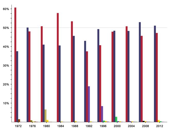 | Keywords: United States presidential election results bar graph (Expanded).png Key FFD900 Libertarian Party 1px AAAAAA solid 3C3B6E Democratic Party 1px AAAAAA solid B22234 Republican Party 1px AAAAAA solid FF0000 Communist Party USA 1px AAAAAA solid 884200 American Independent Party 1px AAAAAA solid 827C1D Eugene J McCarthy 1px AAAAAA solid BDB159 National Unity Party John B Anderson 1px AAAAAA solid 6B47AA Ross Perot/Reform Party of the United States of America 1px AAAAAA solid AB37C8 Constitution Party United States 1px AAAAAA solid 27C851 Greens/Green Party USA/Green Party of the United States 1px AAAAAA solid 000000 Ralph Nader other 1px AAAAAA solid F13A8D Ron Paul other 1px AAAAAA solid Notes <p>Although Ross Perot had not yet formed the Reform Party of the United States of America in 1992 his 1992 run is nevertheless displayed above as a Reform Party run <p>Although the Libertarian Party was on the ballot in all fifty United States plus D C in 2000 the Libertarian Party of Arizona due to a conflict with the national party opted to place L Neil Smith on the ballot in place of the national party's nominee Harry Browne The 5 775 votes received by Smith are included in the party's 2000 total <p>The Green Party that nominated candidates for the presidency in 1996 and 2000 was the Greens/Green Party USA The Green Party that nominated candidates for the presidency ever since has been the Green Party of the United States <p>Although Ron Paul did not run in the general elections of 2008 or 2012 supporters nevertheless got his name on the ballot in some states and got him write-in access in others Ron Paul was also the Libertarian Party nominee in 1988 own 22 March 2016 allixpeeke 200px Bar graph 175px Line graph 175px Expanded line graph Category American Independent Party presidential graphs Cc-zero United States presidential election statistics United States presidential election 1972 United States presidential election 1976 United States presidential election 1980 United States presidential election 1984 United States presidential election 1988 United States presidential election 1992 United States presidential election 1996 United States presidential election 2000 United States presidential election 2004 United States presidential election 2008 Libertarian Party presidential graphs United States Libertarian Party 1972 presidential campaign United States Libertarian Party 1976 presidential campaign United States Libertarian Party 1980 presidential campaign United States Libertarian Party 1984 presidential campaign United States Libertarian Party 1988 presidential campaign United States Libertarian Party 1992 presidential campaign United States Libertarian Party 1996 presidential campaign United States Libertarian Party 2000 presidential campaign United States Libertarian Party 2004 presidential campaign United States Libertarian Party 2008 presidential campaign United States Libertarian Party 2012 presidential campaign United States Democratic Party presidential graphs United States United States Democratic Party 1972 presidential campaign United States Democratic Party 1976 presidential campaign United States Democratic Party 1980 presidential campaign United States Democratic Party 1984 presidential campaign United States Democratic Party 1988 presidential campaign United States Democratic Party 1992 presidential campaign United States Democratic Party 1996 presidential campaign Al Gore presidential campaign 2000 United States Democratic Party 2004 presidential campaign United States Democratic Party 2008 presidential campaign United States Democratic Party 2012 presidential campaign Republican Party presidential graphs United States United States Republican Party 1972 presidential campaign United States Republican Party 1976 presidential campaign United States Republican Party 1980 presidential campaign United States Republican Party 1984 presidential campaign United States Republican Party 1988 presidential campaign United States Republican Party 1992 presidential campaign United States Republican Party 1996 presidential campaign George W Bush presidential campaign 2000 George W Bush presidential campaign 2004 United States Republican Party 2008 presidential campaign United States Republican Party 2012 presidential campaign Green Party of the United States presidential graphs Greens/Green Party USA 1996 presidential campaign Greens/Green Party USA 2000 presidential campaign Green Party of the United States 2004 presidential campaign Green Party of the United States 2008 presidential campaign Green Party of the United States 2012 presidential campaign Constitution Party presidential graphs United States U S Taxpayers Party 1992 presidential campaign U S Taxpayers Party 1996 presidential campaign Constitution Party 2000 presidential campaign United States Constitution Party 2004 presidential campaign United States Constitution Party 2008 presidential campaign United States Constitution Party 2012 presidential campaign United States Ron Paul graphs Ron Paul presidential campaign 2008 Ron Paul presidential campaign 2012 Ralph Nader graphs Ralph Nader presidential campaign 2000 Ralph Nader presidential campaign 2008 Reform Party of the United States of America presidential graphs Ross Perot presidential campaign 1992 Reform Party of the United States of America 1996 presidential campaign Reform Party of the United States of America 2000 presidential campaign Reform Party of the United States of America 2004 presidential campaign Communist Party USA presidential graphs National Unity Party presidential graphs United States Eugene McCarthy presidential graphs Political bar charts Electoral timelines of the United States of America Gary Johnson graphs |