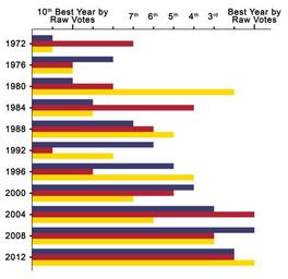 | Keywords: United States presidential ordinal interyear intraparty results comparison of raw popular votes bar graph.png Key FFD900 Libertarian Party 1px AAAAAA solid 3C3B6E Democratic Party 1px AAAAAA solid B22234 Republican Party 1px AAAAAA solid Note This graph ordinally charts in terms of raw popular votes the various prominent United States of America national parties' various presidential runs since 1972 in relation to one another as opposed to charting their various presidential runs in relation to the other United States of America national parties' various presidential runs For example using this graph one can see that the Libertarian Party had its highest raw popular vote count in 2012 and its fourth-highest raw popular vote count in 1996 or that the Democratic Party had its eighth-highest raw popular vote count since 1972 in 1976 or that the Republican Party had its eleventh-highest raw popular vote count since 1972 in 1992 alexpeak com 22 March 2016 allixpeeke 200px Expanded bar graph Cc-zero United States presidential election statistics United States presidential election 1972 United States presidential election 1976 United States presidential election 1980 United States presidential election 1984 United States presidential election 1988 United States presidential election 1992 United States presidential election 1996 United States presidential election 2000 United States presidential election 2004 United States presidential election 2008 Libertarian Party presidential graphs United States Libertarian Party 1972 presidential campaign United States Libertarian Party 1976 presidential campaign United States Libertarian Party 1980 presidential campaign United States Libertarian Party 1984 presidential campaign United States Libertarian Party 1988 presidential campaign United States Libertarian Party 1992 presidential campaign United States Libertarian Party 1996 presidential campaign United States Libertarian Party 2000 presidential campaign United States Libertarian Party 2004 presidential campaign United States Libertarian Party 2008 presidential campaign United States Libertarian Party 2012 presidential campaign United States Democratic Party presidential graphs United States United States Democratic Party 1972 presidential campaign United States Democratic Party 1976 presidential campaign United States Democratic Party 1980 presidential campaign United States Democratic Party 1984 presidential campaign United States Democratic Party 1988 presidential campaign United States Democratic Party 1992 presidential campaign United States Democratic Party 1996 presidential campaign Al Gore presidential campaign 2000 United States Democratic Party 2004 presidential campaign United States Democratic Party 2008 presidential campaign United States Democratic Party 2012 presidential campaign Republican Party presidential graphs United States United States Republican Party 1972 presidential campaign United States Republican Party 1976 presidential campaign United States Republican Party 1980 presidential campaign United States Republican Party 1984 presidential campaign United States Republican Party 1988 presidential campaign United States Republican Party 1992 presidential campaign United States Republican Party 1996 presidential campaign George W Bush presidential campaign 2000 George W Bush presidential campaign 2004 United States Republican Party 2008 presidential campaign United States Republican Party 2012 presidential campaign Political bar charts Charts in English Electoral timelines of the United States of America Gary Johnson graphs |
