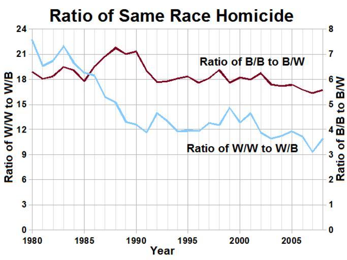 Keywords: United States Ratio of Same Race Homicide.png en Ratio of same race homicide in the United States to someone of the opposite race In 2008 whites killed other whites 10 9 times as often as they killed someone who was black and blacks killed other blacks 5 6 times as often as they killed someone who was white The rate did not change very much from 1980 for blacks when it was 6 3 but was twice as high for whites 22 8 that year Blacks have been killing about the same number of whites 6 6 per 100 000 vs 8 0 per 100 000 in 2008 but whites have been killing significantly more blacks 2 1 per 100 000 vs 3 7 per 100 000 But blacks mostly kill other blacks and whites mostly kill other whites 2014-07-04 own Delphi234 cc-zero Uploaded with UploadWizard Homicide rates |