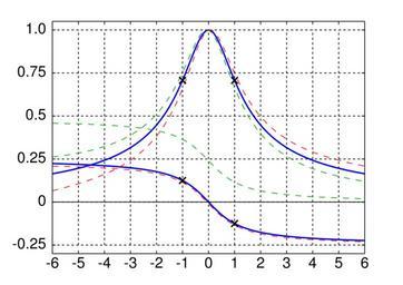 | Keywords: Universal Resonance Curve.svg en Frederick E Terman's Universal Resonance Curve a symmetric approximation to the normalized response of a resonant circuit; abscissa values are deviation from Fc in units of Fc/ 2Q the 3dB-half-bandwidth; ordinate is relative amplitude and phase in cycles The upper green dashed phase curve is from a system of two poles and no zero which lags 90 degrees 0 25 cycle at resonance The other red dashed curves are for a pair of poles with a zero at DC at s 0 in Laplace notation which is what is usually approximated by the universal resonance curve or was in Siebert; in terms of magnitude gain it is asymmetric in the opposite direction of the green curve These curves are calculated for a Q value of 4; higher Q values will give curves closer to the universal curve The X's represent deviations of one half-bandwidth plus or minus Fc/2Q the -3dB points gains of 0 707 and phase shifts of 45 degrees 0 125 cycle self made roughly about Siebert 1986 http //books google com/books id zBTUiIrb2WIC pg PA113 dq siebert+universal-resonance-curve ei qtjbSruNBInmkATFrqyeCA v onepage q f false Circuits Signals and Systems p 113 Richard F Lyon User Dicklyon 2009-10 Electronics Cauchy-Lorentz distributions Resonance dddddd |