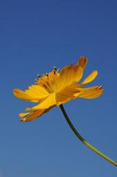 Keywords: universe plant cosmos flower single blue sky background yellow petals