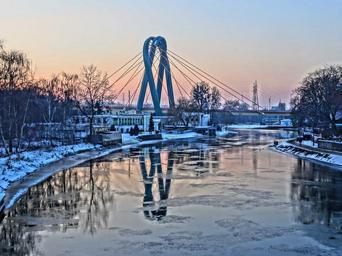 Keywords: university bridge bydgoszcz poland river canal crossing structure pylon winter