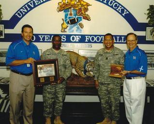 | Keywords: University of Kentucky Athletics Honored by United States Army.jpg en 11th University of Kentucky President Lee T Todd Jr and Athletic Director Mitch Barnhart accept recognitions from United States Army General Albert Bryant Jr Deputy Commander of Fort Knox Kentucky with Command Sergeant Major Otis Smith in 2005 The University of Kentucky maintains a close relationship with and supports the soldiers and civilians of nearby Fort Knox and the U S Armed Forces hosting regular UK hosts Fort Knox Day events to honor the nation's serving men and women 2005-09-17 Fort Knox Public Affairs Office - http //www knox army mil/center/pao - 502 624-4985 provided electronically 2005 United States Army/Fort Knox Public Affairs Office PD-USGov-Military-Army PD-USGov University_of_Kentucky_athletics University_of_Kentucky African-American military personnel Generals of the United States Army Albert Bryant Jr Uploaded with UploadWizard |