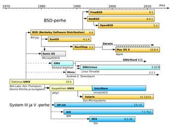 | Keywords: Unix timeline.fi.svg English This picture shows the relations between several Unix systems in Finnish<br />Suomi Tämä kuva näyttää eri Unix-järjestelmien väliset suhteet suomeksi 2007-07-31 Original image Image Unix history svg Hapo touched up the redrawn image Original image was public domain Unix timelines Diagrams in Finnish |