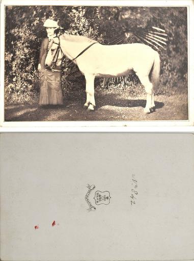 | Keywords: cabinet card cabinetcard public domain publicdomain Aside from being a lovely portrait, the real mystery here is the photographer. The stamp on the reverse simply has four initials - possibly H.H.G.H. - and the small shield has the banner "To Arms". The photograph appears to contain a palm leaf (behind the horse's hind quarters) which may link it to images from Sri Lanka or other Asian locations in this album. --- One of 140 images from a fascinating album. For more information see the full set From 26-28 February I will be in the Truprint Photography Gallery at the Who Do You Think You Are? Live event at London's Olympia. In the run up to that event, and with the help of show visitors over the three days, my aim is to use this album as an example of how Flickr, and the wider web community, can help identify these mystery, orphaned photograhs. Just how many of these images can we identify, and what can we find out about the people they portray? Aside from being a lovely portrait, the real mystery here is the photographer. The stamp on the reverse simply has four initials - possibly H.H.G.H. - and the small shield has the banner "To Arms". The photograph appears to contain a palm leaf (behind the horse's hind quarters) which may link it to images from Sri Lanka or other Asian locations in this album. --- One of 140 images from a fascinating album. For more information see the full set From 26-28 February I will be in the Truprint Photography Gallery at the Who Do You Think You Are? Live event at London's Olympia. In the run up to that event, and with the help of show visitors over the three days, my aim is to use this album as an example of how Flickr, and the wider web community, can help identify these mystery, orphaned photograhs. Just how many of these images can we identify, and what can we find out about the people they portray? |