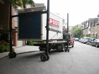 | Keywords: Unloading a shipping container with household contents -b.jpg A new neighbour was moving in and they ordered one of these pods delivered to their old address It was loaded up hoisted onto this flatbed truck using the special frame you see here; driven to the new address; and unloaded The driver had a remote control with five levers for unloading the frame Four of the levers controlled hydroaulic jacks in each of the four legs of the frame A fifth lever drove wheels that could make the frame roll forward or back own 2010-06-19 Geo Swan <span class signature-talk >talk</span> Trucks in Toronto |