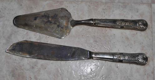 Keywords: Unpolished silverware.jpg en Silver cake knife and server unpolished The black coating is silver sulfide Ag2S own Necessary Evil 2013-06-06 Silver tableware Silver sulfide Cc-zero