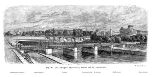 | Keywords: Unterspree-und-Alsen-Bruecke.png en Bridge crossing the Spree river in Berlin built for the street-level inner-city connecting railway de Berlin Verbindungsbahn linking the main railway terminal stations in Berlin This wrought-iron bridge was built 1864/65 to replace the original wooden bridge built in 1851 which was actually located 70 meters upstream The railway traffic ended after the en Berlin Ringbahn replaced the Verbindungsbahn in 1871 The bridge pictured here proved to be unstable and was demolished in 1884 and demolished in 1887 Its place took the en Moltke Bridge built from 1886 until 1891 and which still stands today Schiedeeiserne Unterspree-Brücke über die Spree; gebaut 1864/65 als Ersatz für die 1851 als Teil der alten Berliner Verbindungsbahn gebaute hölzerne Brücke Die hier abgebildete Brücke wurde durch die 1886-1891 gebaute und heute noch stehende de Moltkebrücke ersetzt Berlin und seine Bauten Hrsg vom Architekten-Verein zu Berlin Berlin 1877 Selbstverlag Vertrieb im Buchhandel durch Verlag Ernst und Korn P Meurer X A Xylographische Anstalt 1877 pd-old-70-1923 Berliner Verbindungsbahn Alsenbrücke Moltkebrücke |